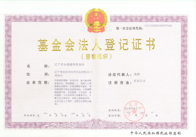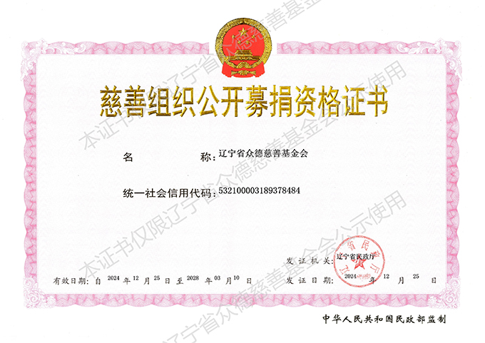辽宁省众德慈善基金会是2015年4月29日经辽宁省民政厅核准成立的非盈利性的公益慈善组织(统一社会信用代码:532100003189378484)。2019年被评为AAAA级社会组织,2020年3月获得公开募捐资格。